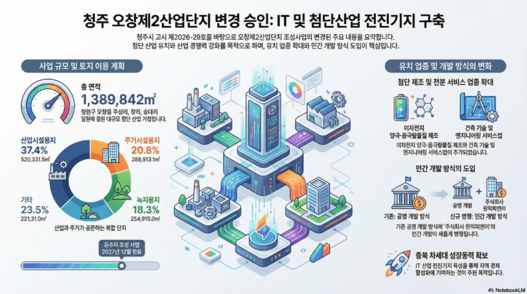 원본파일을 다운받으실수 있습니다. 요약정리 오창 제2산업단지 계획 변경 고시 요약 청주시 고시 제2026-29호 위치 청주시 청원구 오창읍 주성리, 창리, 송대리 일원 고시일 20...